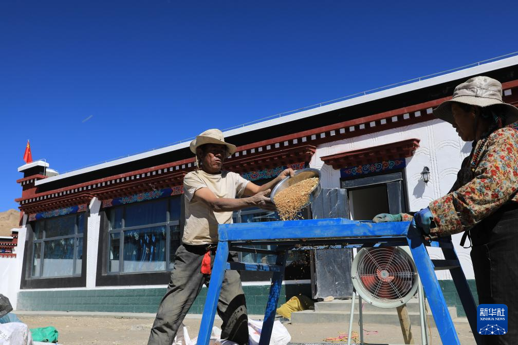 西藏定日縣曲洛鄉(xiāng)措昂村村民旦增(左)在自家新房院子里加工收獲的青稞(10月24日攝)。新華社發(fā)(陳小軍攝)