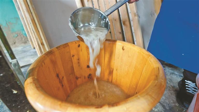 圖為阿旺曲央在攪拌原料,制備紙漿。