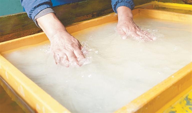 圖為阿旺曲央反復(fù)攪拌紙漿,持續(xù)調(diào)和使其更緊密均勻。