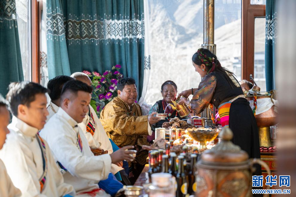 1月20日,西藏日喀則市桑珠孜區(qū)聶日雄鄉(xiāng)楚松村村民多吉旺堆家的晚輩在給長輩敬青稞酒。新華網(wǎng) 旦增努布 攝