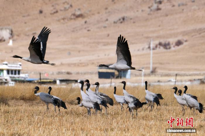 黑頸鶴是中國(guó)國(guó)家一級(jí)保護(hù)動(dòng)物,是唯一生活、繁殖在高原的鶴類,被藏族民眾譽(yù)為“吉祥鳥(niǎo)”。近日,西藏自治區(qū)拉薩市林周縣林業(yè)和草原局介紹,作為黑頸鶴重要的越冬棲息地,今年該縣境內(nèi)黑頸鶴數(shù)量在1800只至2300只之間,其中虎頭山水庫(kù)卡東村一帶占比約一半。中新網(wǎng)記者在周邊看到,不少黑頸鶴在田間覓食,不時(shí)飛翔于高原農(nóng)田、村落上空,舞動(dòng)的鶴影和聲聲鶴鳴為冬春時(shí)節(jié)的高原增添了幾分靈動(dòng)。圖為2月8日,黑頸鶴群在悠閑覓食。江飛波 攝