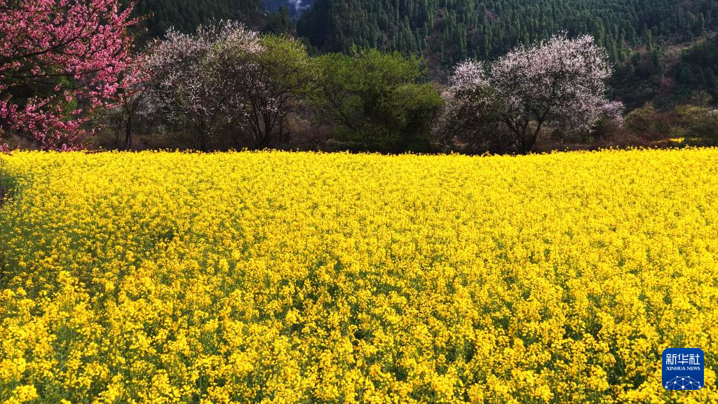 3月20日在西藏林芝市波密縣易貢鄉(xiāng)拍攝的油菜花與桃花(無人機(jī)照片)。新華社記者 普布次仁 攝