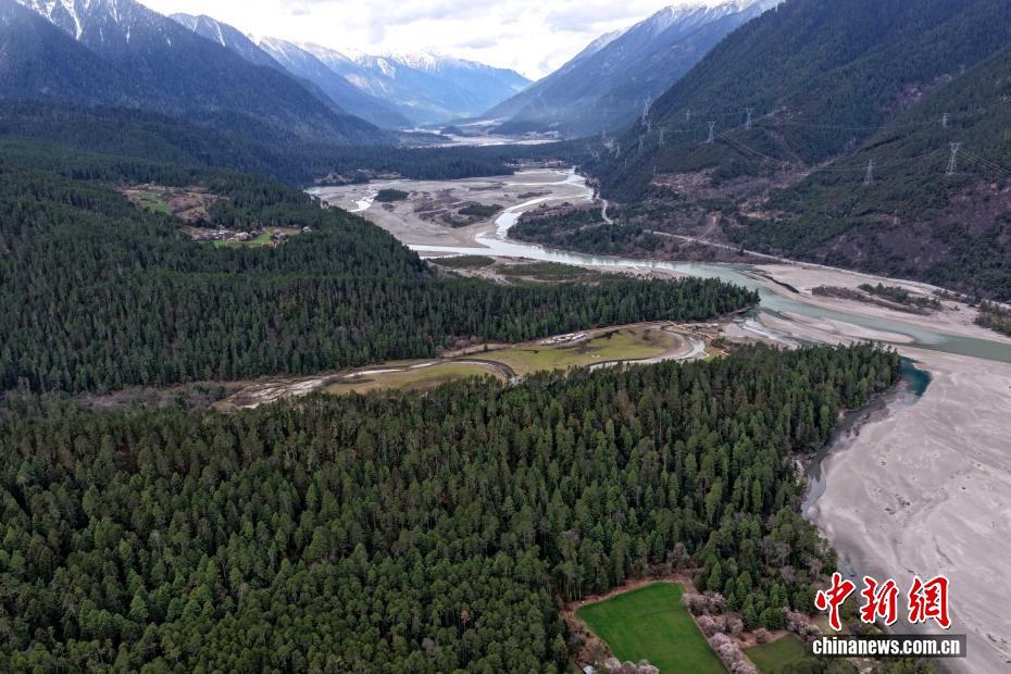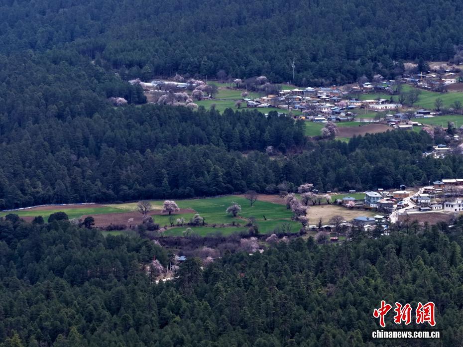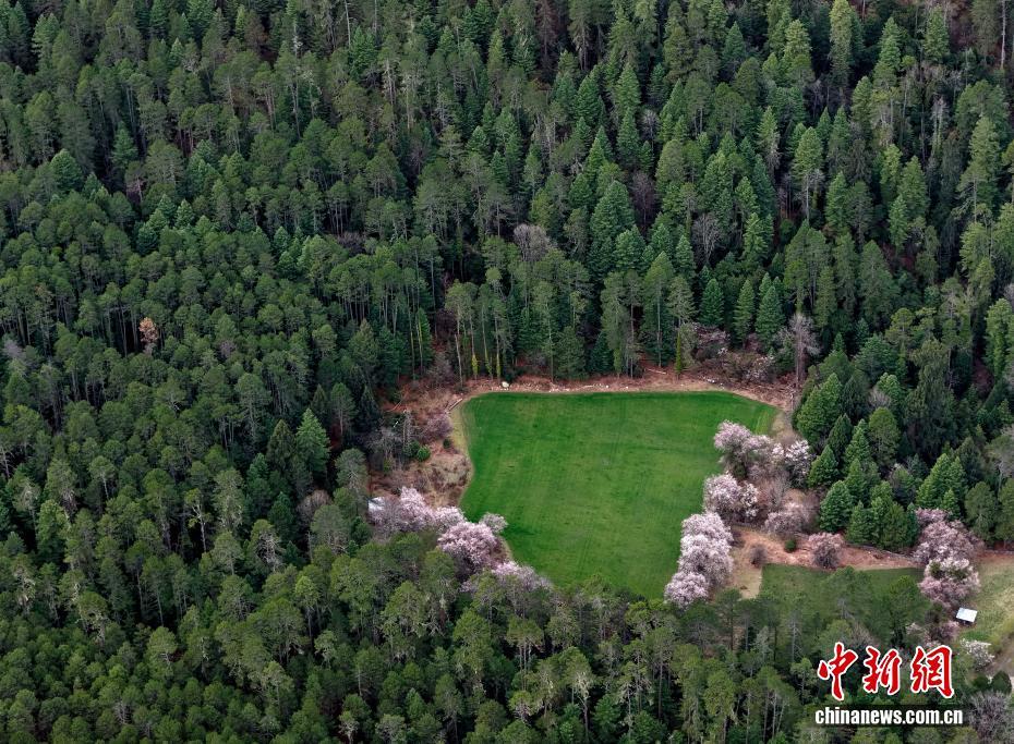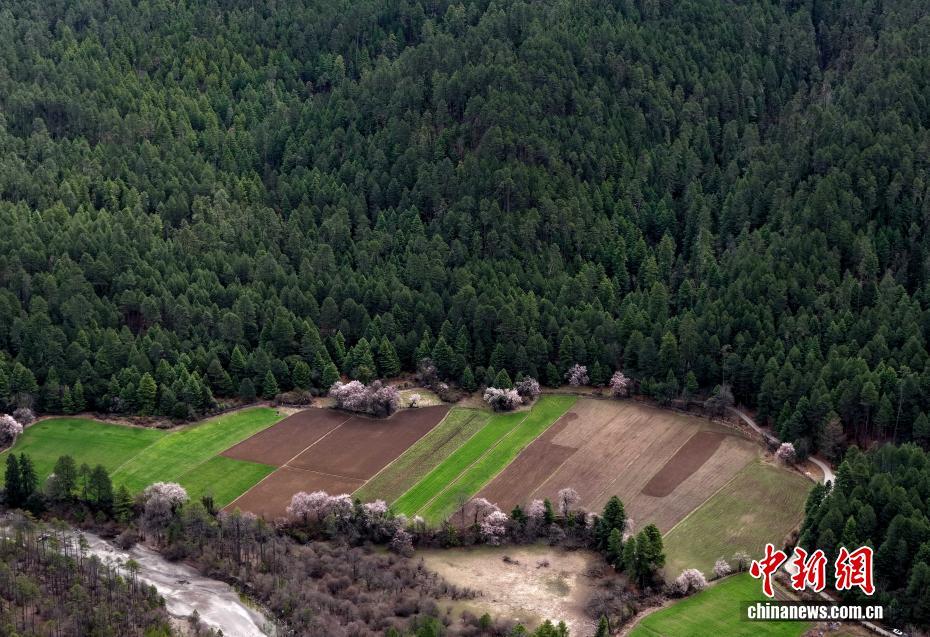 3月26日,西藏波密桃花林海相映成趣。崗云杉林位于西藏林芝市波密縣,森林覆蓋率達(dá)61%以上,海拔2700米左右。俯瞰崗云杉林,周邊桃花綻放,與密林、農(nóng)田構(gòu)成美麗自然畫卷。(無人機(jī)照片)中新社記者 李林 攝