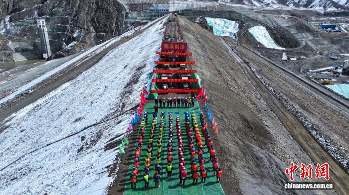 西藏帕孜水利樞紐工程主壩封頂現(xiàn)場(chǎng)。中國(guó)水電基礎(chǔ)局有限公司供圖
