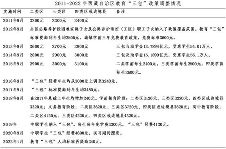黨的十八大以來,“三包(包吃、包住、包學(xué)費)”人均標(biāo)準(zhǔn)不斷大幅提升。2012年起,西藏全面落實15年公費教育“三包”政策。同年底,西藏“三包”年總經(jīng)費由2008年的3.61億元增加到12.29億元,年均增幅達36%,受惠學(xué)生增加到51萬人。 到2014年,西藏“三包”經(jīng)費增加到15.19億元,全區(qū)有52.5萬名學(xué)生受益,覆蓋面100%,實現(xiàn)了由“選擇性保障”到“覆蓋式保障”。 中央第六次西藏工作座談會后,投入力度更大。1985-2015年30年間,西藏“三包”經(jīng)費累計投入逾80億元, 而到2020年35年投入超200億元。僅2016-2020年,西藏教育“三包”資金投入達104.74億元,年均增幅11.4%。 從1985年到2020年的35年間,西藏教育“三包”政策累計調(diào)整20次,2011-2020年的10年間,就調(diào)整了10次。2022年1月,“三包”人均標(biāo)準(zhǔn)再次提高。在比如縣,2021年底全縣享受“三包”及助學(xué)金的學(xué)生達到17771人, 占比如縣總?cè)丝诘?4.5%。