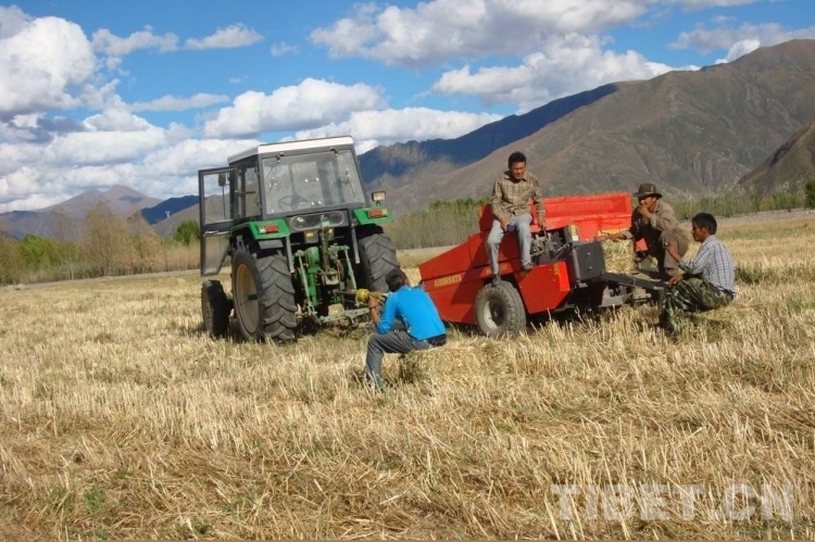 圖為西藏自治區(qū)農牧科學院草業(yè)科學研究所科技人員正在開展飼用燕麥青干草打捆試驗示范