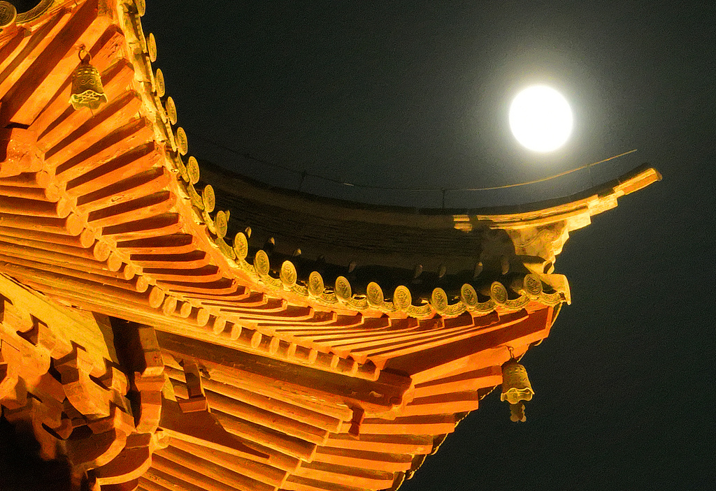 江蘇蘇州古城夜空一輪中秋明月與千年瑞光塔交相輝映。