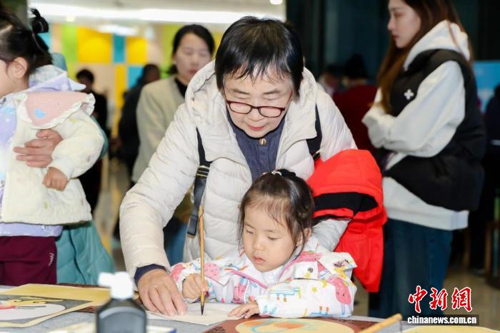 中國宋慶齡青少年科技文化交流中心(以下簡稱“宋慶齡青少中心”)一層中庭,鋪著素色宣紙的長桌旁,63歲的靳文虎握著孫兒靳翊言小朋友的手,共同繪制一幅秋日花卉圖,“來,寶貝,感覺筆在走路?!?/p>
