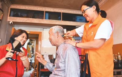河南省洛陽(yáng)市澗西區(qū)積極構(gòu)建“嵌入式”養(yǎng)老服務(wù)體系,為老年人提供養(yǎng)老助餐、社區(qū)娛樂(lè)、健康管理、上門保潔等綜合養(yǎng)老服務(wù)項(xiàng)目,讓老人在家門口享受全方位養(yǎng)老。圖為澗西區(qū)武漢路街道秦嶺路社區(qū),養(yǎng)老服務(wù)中心護(hù)理員和社區(qū)志愿者為居家老人理發(fā)。黃政偉攝(人民視覺(jué))
