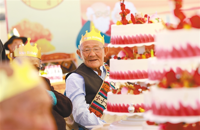 圖為拉薩市墨竹工卡縣民政局和退役軍人事務(wù)局舉行“我們的節(jié)日·重陽”主題活動,現(xiàn)場為老人們集體過生日。記者 唐斌 通訊員 洛克 攝