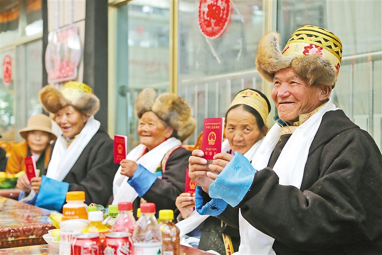 圖為山南市瓊結(jié)縣特困人員集中供養(yǎng)服務(wù)中心的“新人”阿南高興地展示自己的結(jié)婚證。記者 白瑪澤旺 通訊員 倫珠澤旺 攝