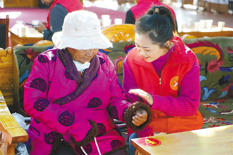 圖為那曲市索縣新時代文明實踐中心為特困人員集中供養(yǎng)服務(wù)中心的老人送去關(guān)心和關(guān)愛。記者 曲珍 通訊員 王霖 攝