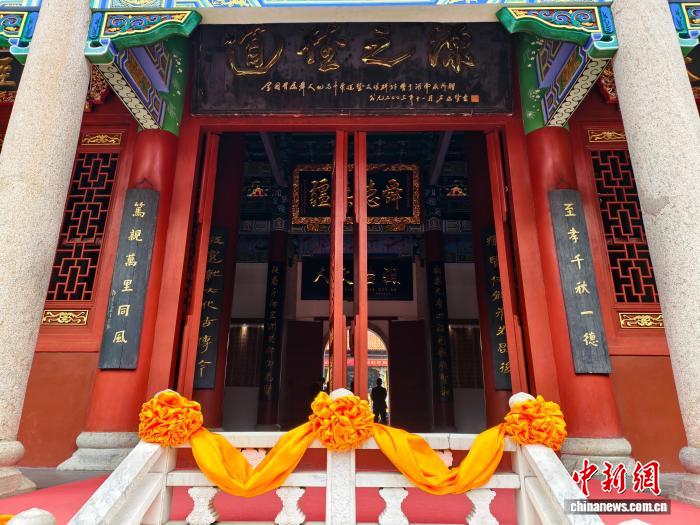 2025年10月28日,200余名海峽兩岸同胞在湖南省永州市寧遠縣九嶷山瑤族鄉(xiāng)舜帝陵,參加“祭舜帝 傳仁心 旺天下”乙巳年旺旺集團祭祀舜帝典禮,共祭中華民族的人文始祖舜帝。圖為九嶷山舜帝陵拜殿入口。中新社記者 胡默達 攝