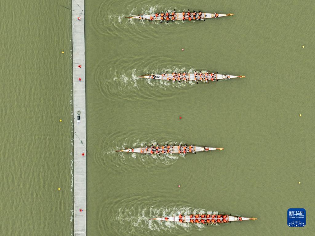 6月17日,在江蘇省宿遷市泗洪縣臨淮鎮(zhèn)水上運動中心,人們參加龍舟競渡比賽(無人機照片)。新華社發(fā)(許昌亮攝)