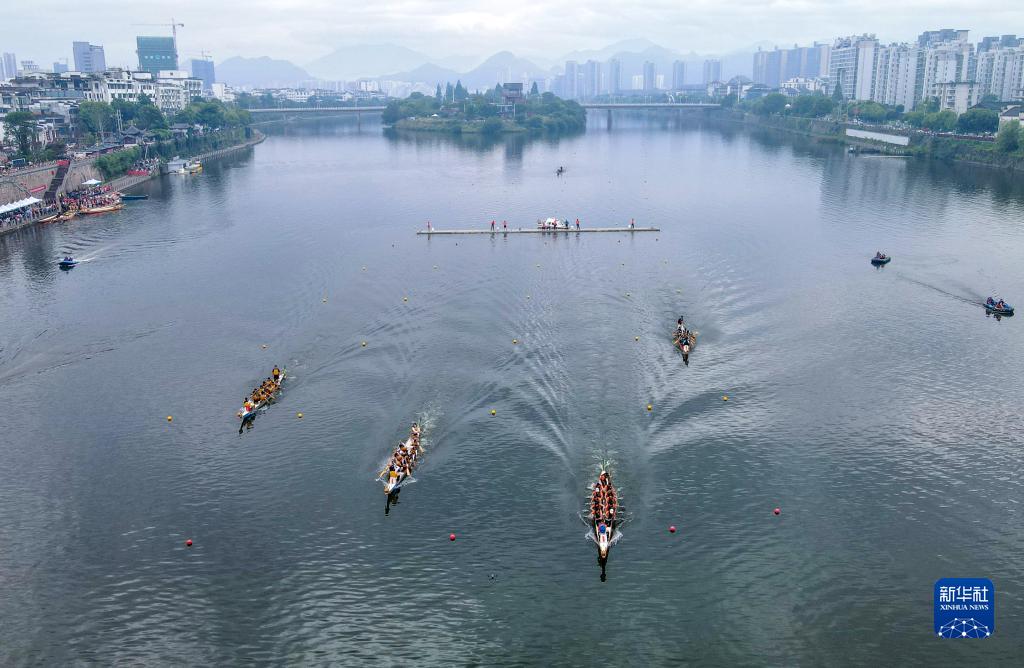 6月18日,龍舟隊(duì)在安徽省黃山市屯溪區(qū)新安江水域上展開角逐。