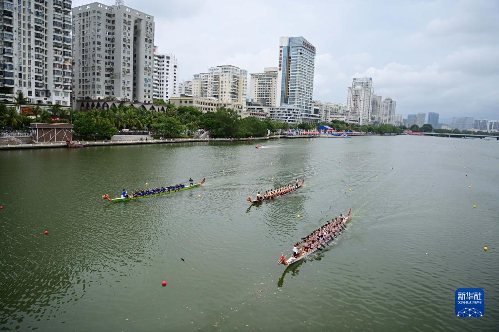 6月18日,龍舟隊(duì)在海南省三亞市三亞河上進(jìn)行比賽。新華社發(fā)(沙曉峰攝)