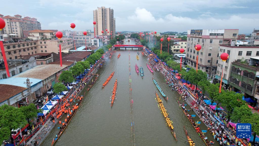 6月18日,龍舟隊(duì)在廣東省肇慶市高要區(qū)金利鎮(zhèn)西圍涌參賽。新華社發(fā)(劉春林?jǐn)z)