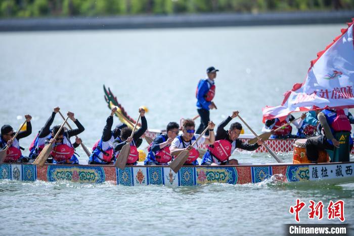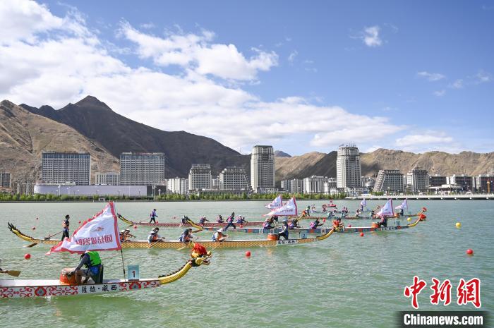 6月9日,2024年西藏自治區(qū)端午節(jié)牛皮船(龍舟)賽在拉薩市濱河公園水域舉辦。據(jù)悉,本次賽事系西藏首次舉辦、也是中國國內(nèi)海拔最高的牛皮船(龍舟)賽 。比賽邀請了來自遼寧、湖北、湖南、四川、云南、貴州和廣西壯族自治區(qū)的30名龍舟運動員,與西藏區(qū)內(nèi)的30名龍舟運動員以及40名牛皮船運動員進(jìn)行同場競技。圖為龍舟比賽現(xiàn)場。貢嘎來松 攝