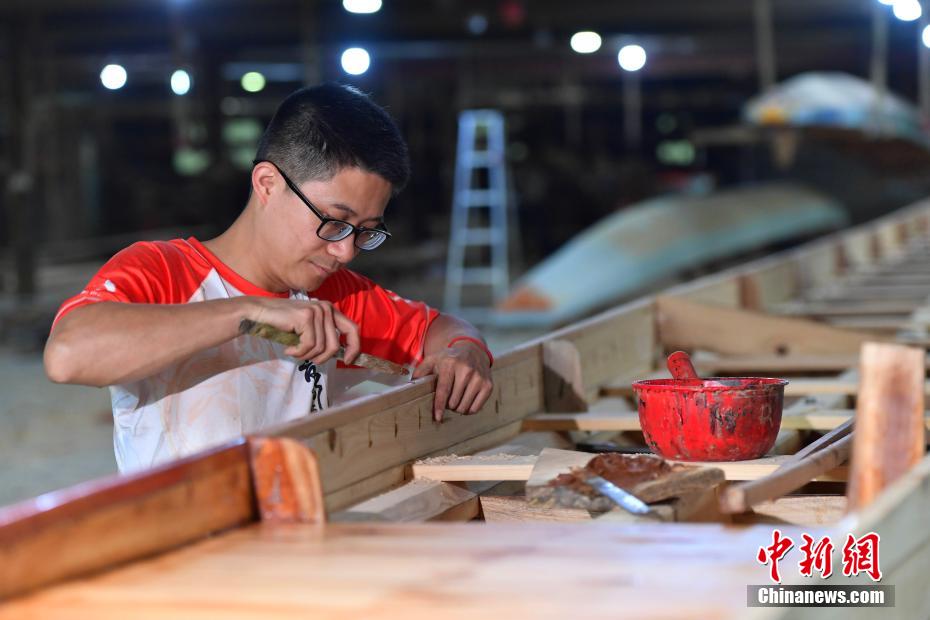 “世界龍舟看中國,中國龍舟看福州,福州龍舟看方莊?!蔽挥诟=ㄊ「V菔虚}侯縣的方莊村,是中國最大的龍舟制造村,有著七百多年制作龍舟的歷史。隨著端午節(jié)臨近,方莊村內(nèi)的龍舟制造廠里,工匠們正加班加點(diǎn)趕制端午節(jié)的龍舟訂單。據(jù)統(tǒng)計(jì),目前該村每年能接到超過200艘龍舟的訂單,總產(chǎn)值約600萬元人民幣。圖為5月25日,在方莊村的“龍舟世家”方忠雄龍舟廠里,“方莊龍舟制造技藝(閩侯縣)”第四代傳承人方劍偉在趕制端午節(jié)的龍舟訂單。中新社記者 張斌 攝