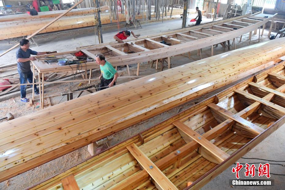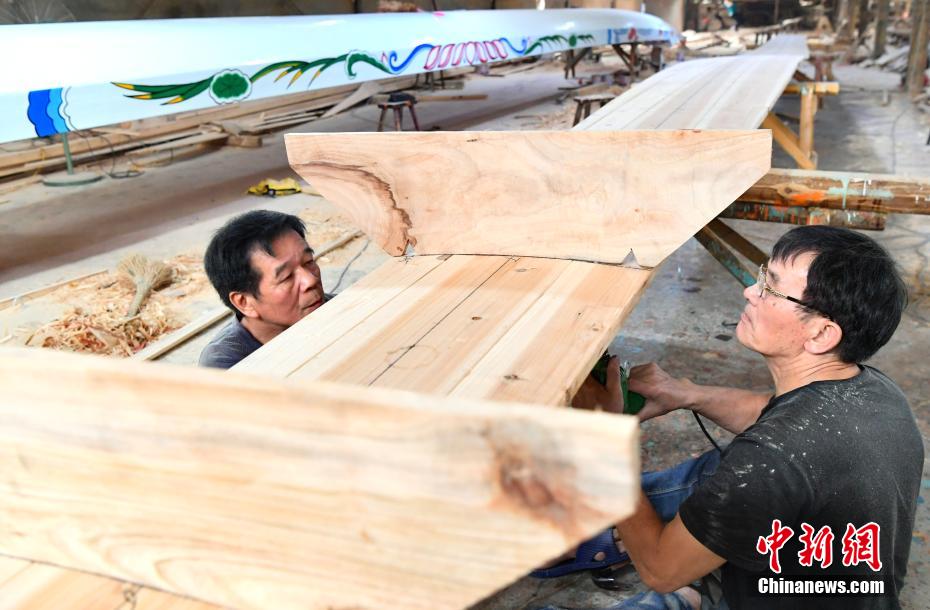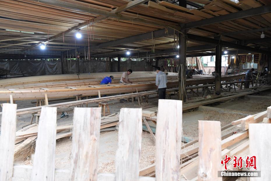 “世界龍舟看中國,中國龍舟看福州,福州龍舟看方莊?!蔽挥诟=ㄊ「V菔虚}侯縣的方莊村,是中國最大的龍舟制造村,有著七百多年制作龍舟的歷史。隨著端午節(jié)臨近,方莊村內(nèi)的龍舟制造廠里,工匠們正加班加點(diǎn)趕制端午節(jié)的龍舟訂單。據(jù)統(tǒng)計(jì),目前該村每年能接到超過200艘龍舟的訂單,總產(chǎn)值約600萬元人民幣。圖為5月25日,在方莊村的“龍舟世家”方忠雄龍舟廠里,師傅在趕制端午節(jié)的龍舟訂單。中新社記者 張斌 攝