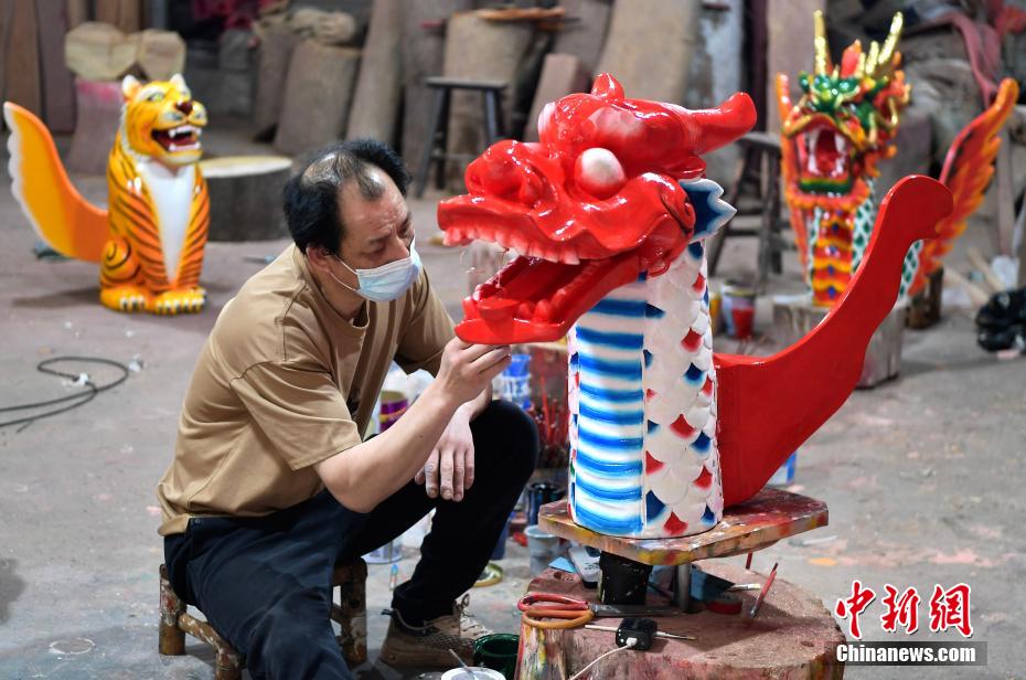 “世界龍舟看中國,中國龍舟看福州,福州龍舟看方莊?!蔽挥诟=ㄊ「V菔虚}侯縣的方莊村,是中國最大的龍舟制造村,有著七百多年制作龍舟的歷史。隨著端午節(jié)臨近,方莊村內(nèi)的龍舟制造廠里,工匠們正加班加點(diǎn)趕制端午節(jié)的龍舟訂單。據(jù)統(tǒng)計(jì),目前該村每年能接到超過200艘龍舟的訂單,總產(chǎn)值約600萬元人民幣。圖為5月25日,在方莊村的一家龍舟龍頭制造廠里,師傅正在制作各式龍頭。中新社記者 張斌 攝
