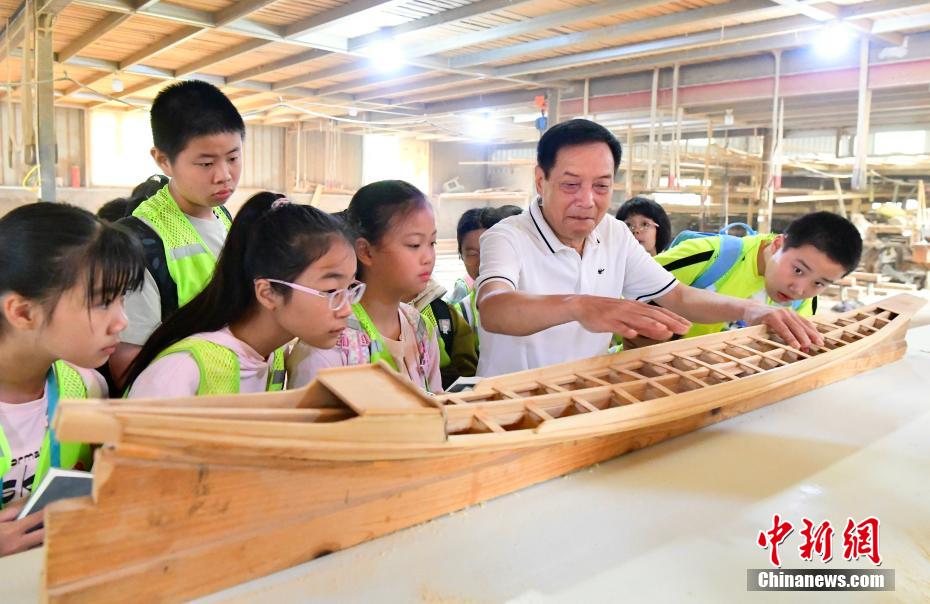 “世界龍舟看中國,中國龍舟看福州,福州龍舟看方莊?!蔽挥诟=ㄊ「V菔虚}侯縣的方莊村,是中國最大的龍舟制造村,有著七百多年制作龍舟的歷史。隨著端午節(jié)臨近,方莊村內(nèi)的龍舟制造廠里,工匠們正加班加點(diǎn)趕制端午節(jié)的龍舟訂單。據(jù)統(tǒng)計(jì),目前該村每年能接到超過200艘龍舟的訂單,總產(chǎn)值約600萬元人民幣。圖為5月25日,在方莊村的“龍舟世家”方忠雄龍舟廠里,前來參觀的小學(xué)生在了解傳統(tǒng)龍舟的制作工藝和過程。中新社記者 張斌 攝