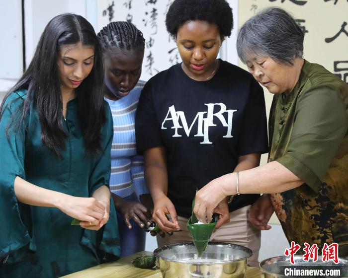 5月27日,在河北省秦皇島市海港區(qū)白塔嶺街道燕大西苑社區(qū),當(dāng)?shù)赝鈬?guó)留學(xué)生相聚一堂,通過包粽子、體驗(yàn)?zāi)景婺戤嫷确绞?,沉浸式體驗(yàn)中華文化的魅力。
