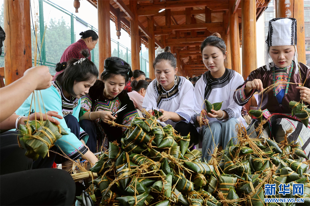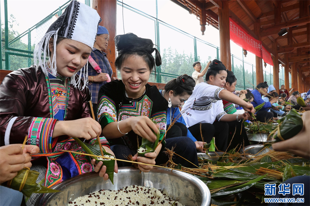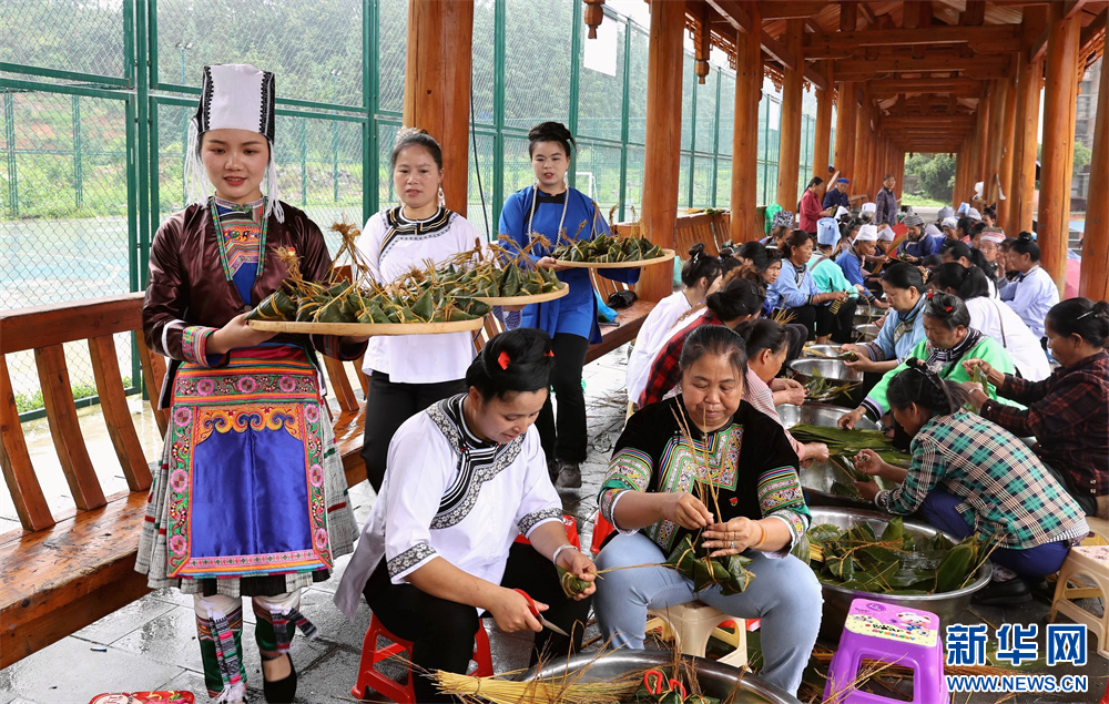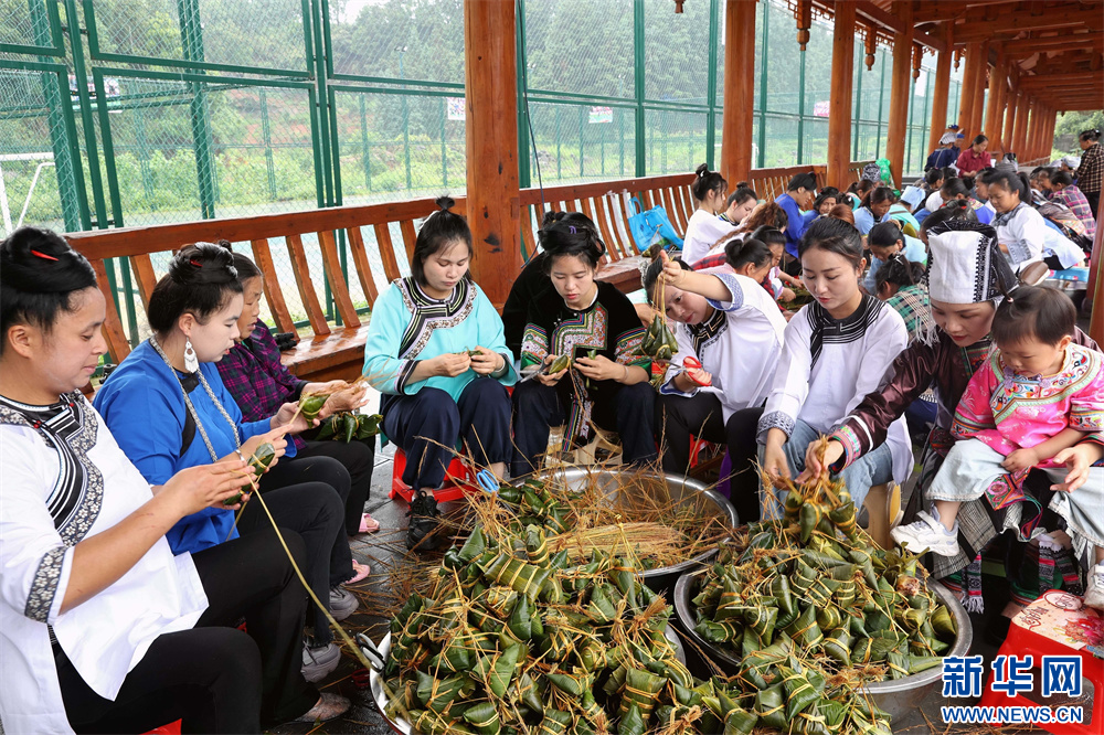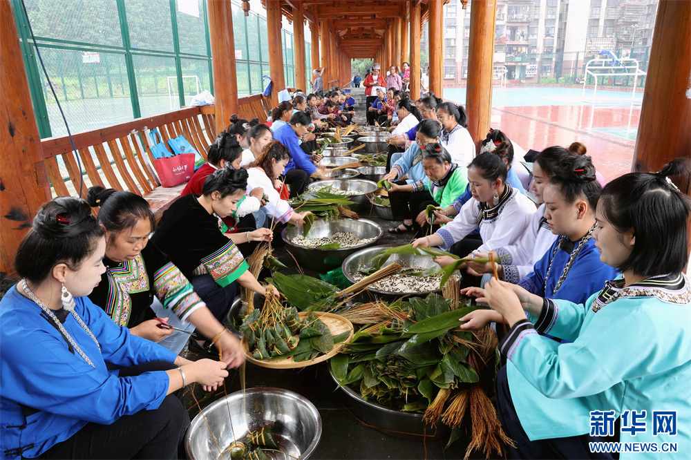 5月28日,市民在貴州省黔東南苗族侗族自治州榕江縣車民街道陽光社區(qū)包粽子。新華網(wǎng)發(fā)(李長華 攝)