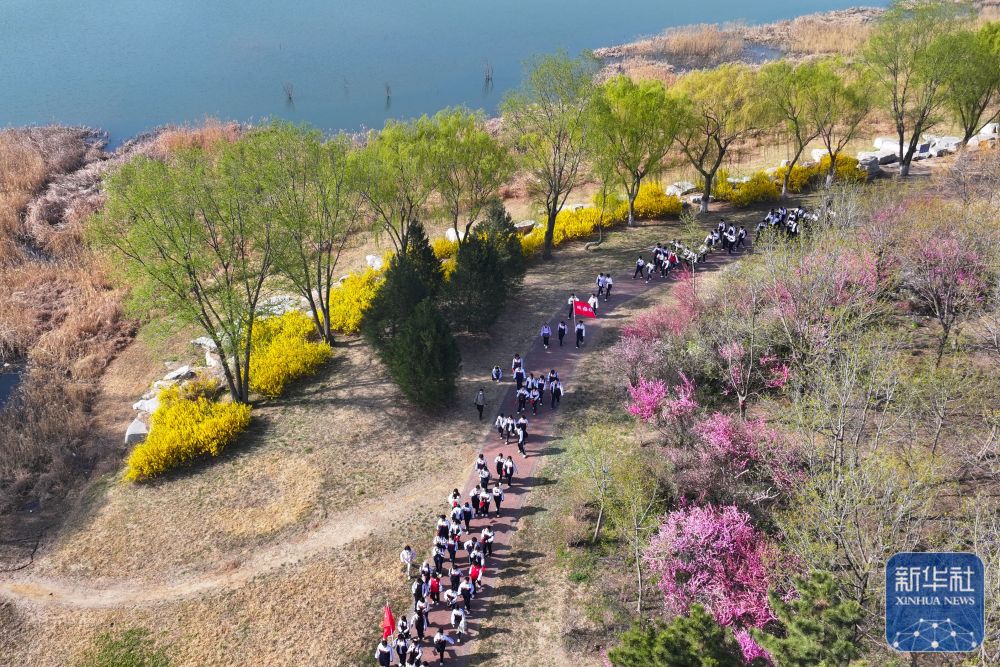 ↑ 4月3日,山東省高密市第五中學(xué)的中學(xué)生在膠河國家濕地公園參加踏青遠足活動(無人機照片)。新華社發(fā)(李海濤攝)