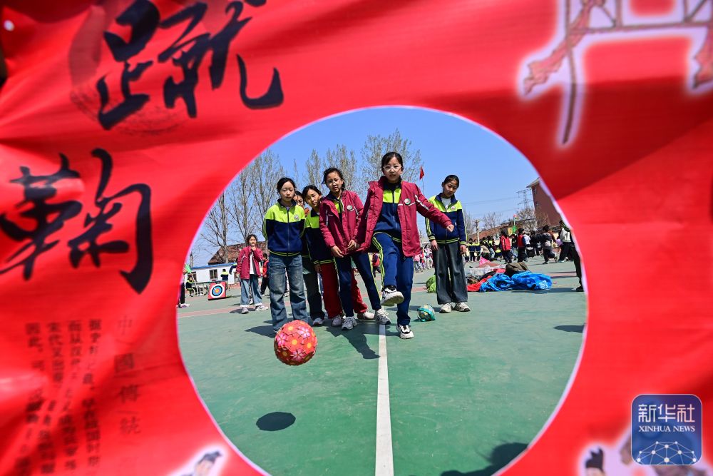 ↑ 4月3日,山東省青州市蘇埠屯學(xué)校學(xué)生體驗蹴鞠。新華社發(fā)(王繼林攝)