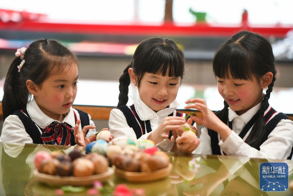↑ 4月3日,在浙江省金華市婺城小學(xué),小學(xué)生在制作清明花草蛋。新華社發(fā)(時寬兵攝)