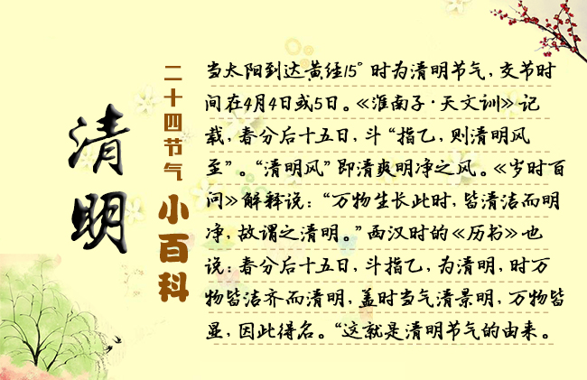 節(jié)選自《二十四節(jié)氣志》/宋英杰 4月5日前后為清明節(jié)氣,氣清景明之意,正是鳥(niǎo)語(yǔ)花香的盛春時(shí)節(jié)?!把匀f(wàn)物去故而從新,莫不鮮明之謂也。”“萬(wàn)物生長(zhǎng)此時(shí),皆清凈明潔,故謂之清明?!鼻迕髦惚碚髁诉@一時(shí)節(jié)的天氣是清新、明媚、和暖的。