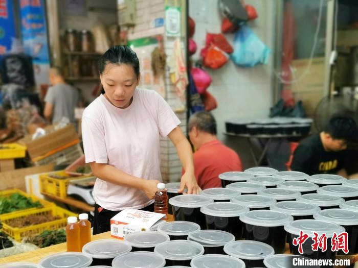 7月27日,廣東臺(tái)山市臺(tái)城富城市場(chǎng),一攤主為客人打包小桶裝茯苓膏。李曉春 攝