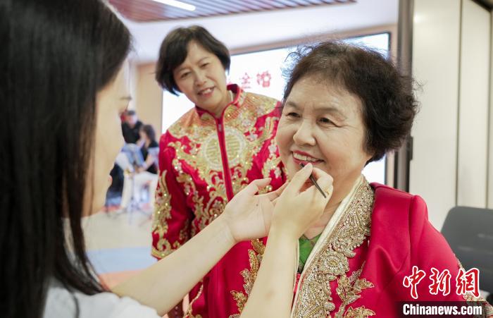 七夕將至,河北省邯鄲市老人走進(jìn)叢臺(tái)區(qū)光明橋街道天璽苑社區(qū),參加“七夕迎金婚 共創(chuàng)好家風(fēng)”慶典,回憶半個(gè)世紀(jì)的愛情。金婚慶典儀式經(jīng)過牽手入場(chǎng)、夫妻對(duì)拜、執(zhí)子之手、回憶往昔等環(huán)節(jié),見證了金婚夫妻們相濡以沫、互敬互愛的美滿婚姻。金婚老人結(jié)合親身經(jīng)歷,分享家風(fēng)家訓(xùn)及愛情故事,講述家庭幸福的秘訣,“曬”出婚姻保鮮的秘籍,分享婚姻的經(jīng)營智慧。圖為8月6日,老人正在化妝。王倩倩 攝
