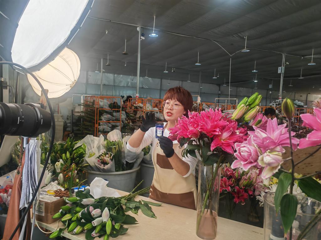 在昆明國際花卉拍賣交易中心附近,近年來新建了許多鮮花直播間,主播每天在各電商平臺直播售賣鮮花。記者在昆明夢境供應(yīng)鏈有限公司的直播基地看到,多個直播間正在售賣玫瑰、百合花等。