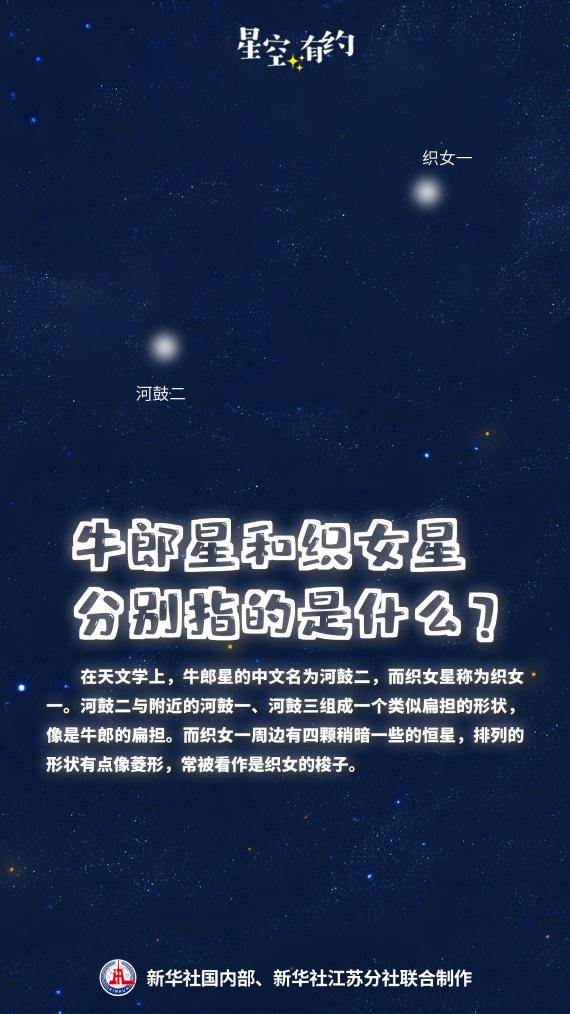 中國科學院紫金山天文臺科普主管王科超說,在天文學上,代表牛郎、織女的天體分別是牛郎星和織女星。牛郎星的中文名為河鼓二,織女星為織女一,它們分別是天鷹座和天琴座的亮星。河鼓二與附近的河鼓一、河鼓三組成一個類似扁擔的形狀,像是牛郎的扁擔。而織女一周邊有四顆稍暗一些的恒星,排列的形狀有點像菱形,常被看作是織女的梭子。