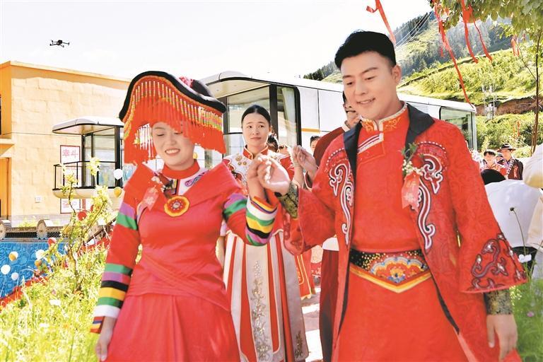 當(dāng)天,在觀眾的祝福下,22對夫婦共進(jìn)“七夕情人康養(yǎng)餐”,漫步情人林,體驗(yàn)原生態(tài)土族婚禮,品鑒非物質(zhì)文化遺產(chǎn)土族圈圈席,觀看大型原創(chuàng)歌舞劇《彩虹部落》,沉浸式感受了一場融合秀美自然風(fēng)光、多民族婚俗、非遺技藝展示、歌舞展演的七夕盛宴。