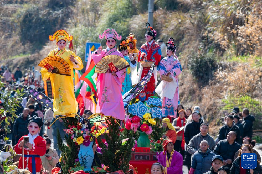 2月10日,浙江省武義縣俞源古村舉行“擎臺(tái)閣”迎元宵大型民俗展演活動(dòng),童男童女扮演的戲曲人物在村中巡游。