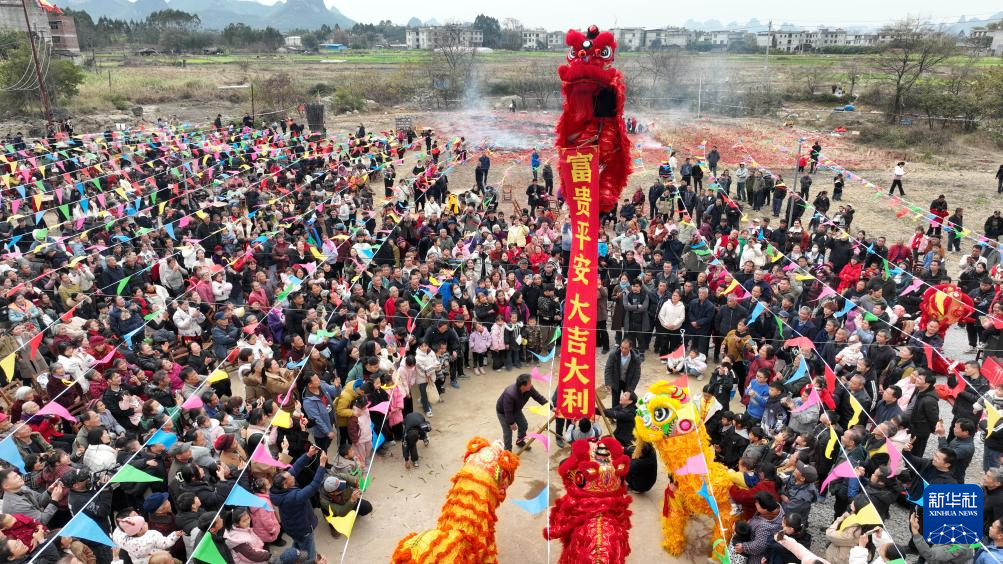 2月9日,廣西柳州市柳江區(qū)進(jìn)德鎮(zhèn)四連村土垢屯,村民在客家“上燈節(jié)”活動(dòng)上進(jìn)行舞獅表演(無(wú)人機(jī)照片)。