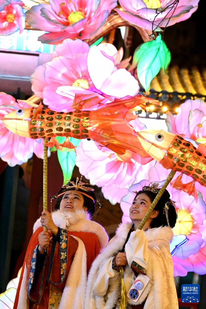 2月8日晚,身著傳統(tǒng)服飾的游人在河北省石家莊市正定榮國(guó)府影視基地內(nèi)游園賞花燈。