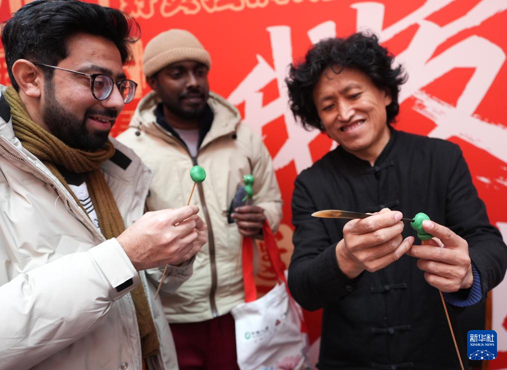 2月11日,在遼寧沈陽(yáng)馬路灣街道,外國(guó)朋友體驗(yàn)面人制作。