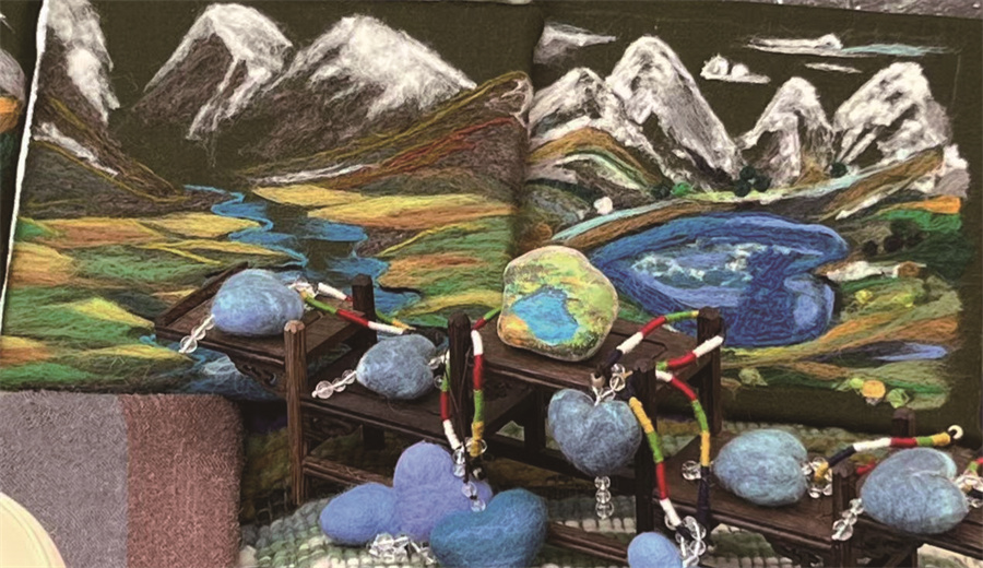 店鋪里的小動(dòng)物文創(chuàng),個(gè)個(gè)憨態(tài)可掬,毛絨絨、圓滾滾很討人喜歡;五彩織繩系著一顆用羊毛纏繞的湛藍(lán)色的心,伸手輕輕按壓時(shí),還會(huì)像心跳般微微起伏……各式各樣的文創(chuàng)包包同樣令人目不暇接。