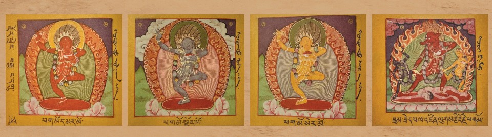 藏文佛經(jīng)古籍中的金剛亥母形象,左起依次為紅色金剛亥母、藍(lán)色金剛亥母、黃色金剛亥母、靜行吉祥持所傳金剛亥母。楚翹翻拍自《五百佛像集:見(jiàn)即獲益》