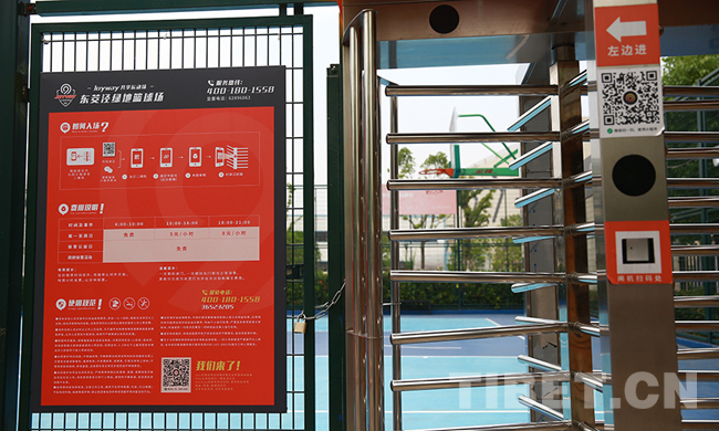 靜安區(qū)東茭涇綠地籃球場。球場采用分時段計費的方式,市民可以通過掃描二維碼使用場地。