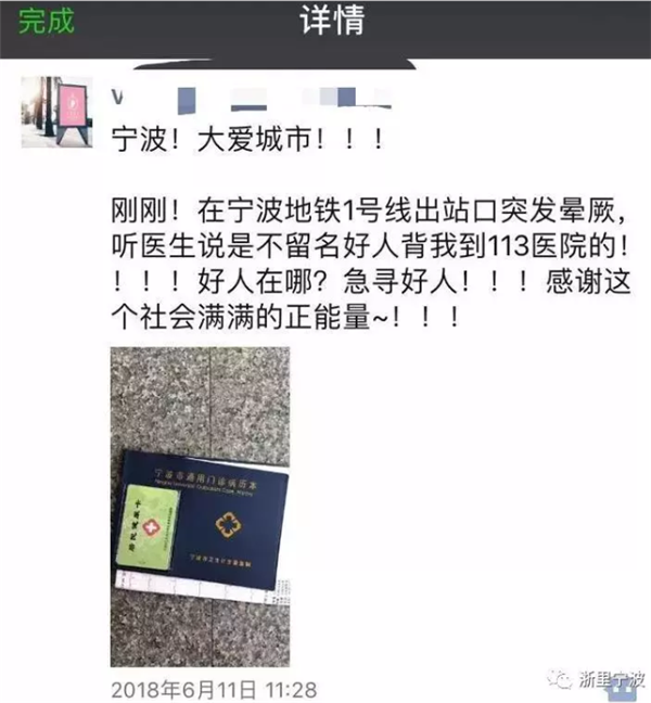 6月11日,許女士在寧波出差時(shí)突然暈倒在地鐵站,一名素不相識(shí)的年輕小伙子抱起她出地鐵站后又背她到附近的寧波解放軍第113醫(yī)院。在得知許女士暈倒是因?yàn)樨氀褵o(wú)大礙后,小伙沒(méi)有留下任何信息離開(kāi)了。