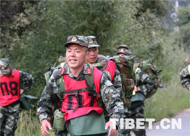 圖為藏族班長覺次仁,一人肩扛兩個背囊,“飛奔”在五公里武裝越野比武考核的路上。