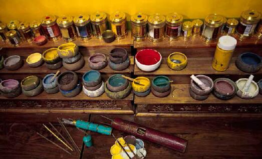 在八廓街古老的夏扎大院里,清晨的光線非常柔和地斜斜照進窗楣里,一樓的一排走廊式狹長的工作坊內,是一群來自日喀則、昌都等不同地方的藏族姑娘,她們愉快地哼著歌謠,一邊用手反復捶硯石盤內的顏料,這些五顏六色的顏料就在陽光下閃爍著迷人的光芒。