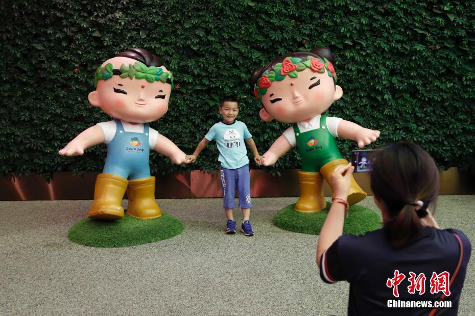6月6日,2019年中國北京世界園藝博覽會(huì)舉辦中國國家館日活動(dòng)。圖為一名兒童在中國館內(nèi)與吉祥物合影留念。中新社記者 韓海丹 攝