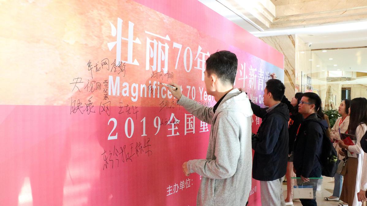 “壯麗70年 奮斗新青?!?019全國(guó)重點(diǎn)網(wǎng)絡(luò)媒體看青?!贝笮筒稍L活動(dòng)正式啟動(dòng),媒體記者在簽到墻上簽名留念