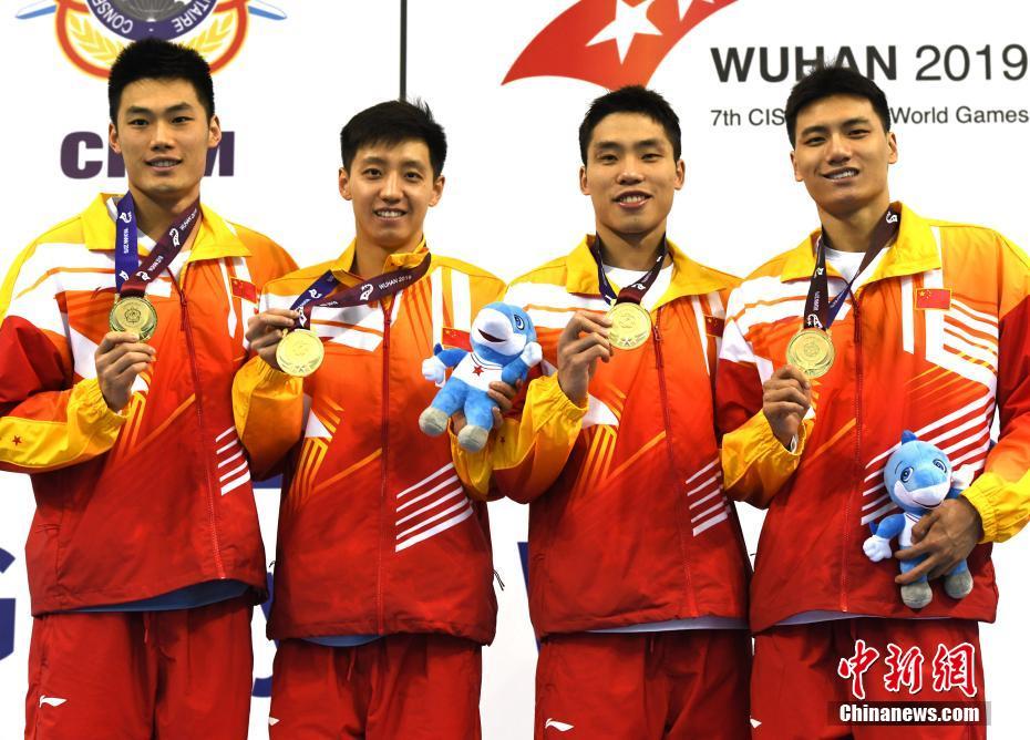 10月22日晚,在湖北省武漢市進行的第七屆世界軍人運動會男子4x50米混合救生接力決賽中,中國隊以1分27秒37的成績獲得冠軍。中新社記者 周毅 攝